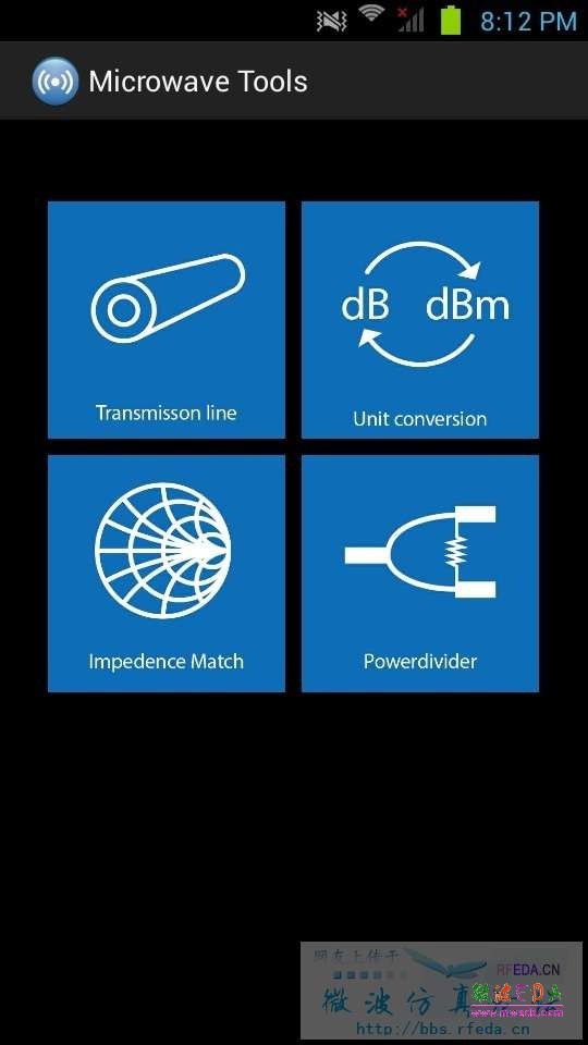 推荐一款基于android系统开发的微波计算工具,该工具包含1.传输线特性阻抗计算2.单位转换3.阻抗匹配4.功分器阻抗计算 等功能,方便各位进行天线设计