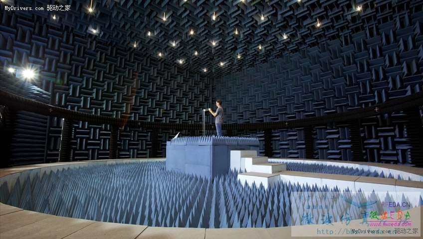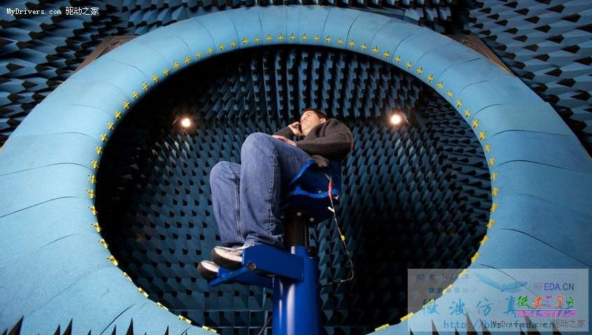 其中,记者们最感兴趣的就是照片中这间实验室,因其布置极似科幻名作《星门》中的布景而被苹果称为“Stargate”。测试者坐在180度旋转的椅子上手持电话,圆环上则分布着64组传感器,测试手持状态下各个方向的信号接收效果。由于吸波室对声波同样有吸收效果,人长时间处于这样的“死寂”状态下将出现严重的心理问题,因此这种有人参与的测试每次最多进行40分钟,而其他测试每次则至少要24小时。