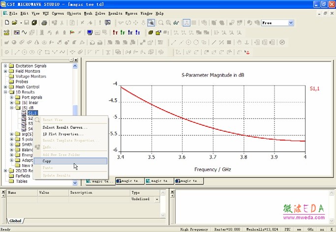 下面举例说明将CST微波工作室的仿真分析结果与外部数据进行比较的具体过程: