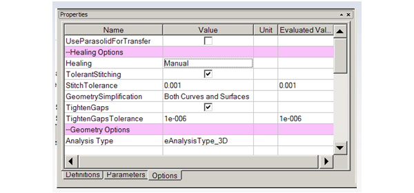 ANSYS Workbench Integration Overview > Healing with CAD IntegrationIt is not possible to use the Heal command in Ansoft Modeler. Instead similar healing options are available under UDM properties option tab. ![]() The Healing options are: None, Auto and Manual. By default healing is off (None) and should be turned on only if required. Related Topics Ansoft CAD Integration Through Workbench CAD Integration and Geometry Sharing Bi-Directional CAD Integration Multiple Geometry Links for CAD Integration Important Geometry Options for CAD Integration