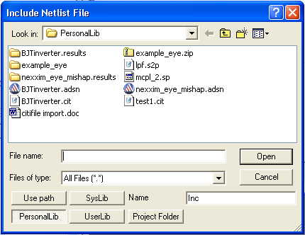 Importing and Exporting Data > Including a Netlist FileTo include a netlist file in the analysis of a circuit: 1. Select the schematic that will include the circuit file. 2. Do either of the following: On the Product menu, point to Add Reference Data, and then click Add Netlist File. Right-click the design’s Data icon in the project window, and then click Add Netlist File. The Include Netlist File dialog box opens.