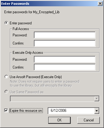 To Generate a New Encrypted Library When you encrypt a library, you have the choice of overwriting the existing target library with the encrypted one, or saving the encrypted library to a new filename or location. The encryption process can respect .prot[ect] statements. During encryption you are prompted whether to encrypt all, or to respect the statements. The steps are as follows: 1. In the Tools > Password Manager dialog box, select a “password protected resource.” The Encrypt File button activates. (If no resources exist, create a new one by clicking “New” and providing a name. You are prompted to supply a password type for the resource. Once the resource is established, any number of libraries may be assigned to it. 2. Click Encrypt File and browse to the library that you want to encrypt. Only filenames of .lib type are valid. 3. Select the .lib file and click Open in the browser. You are prompted to “encrypt the entire file, ignoring any .prot[ect] statements?” Yes and No will both encrypt the file. Yes encrypts all, No will recognize the protect statements. Click Yes or No. 4. A second browser opens, letting you rename or relocate the encrypted file if you wish to. Caution: If you do not rename or relocate the encrypted file, the existing file is overwritten permanently as an encrypted file. 5. Click Save in the browser to create the encrypted library.