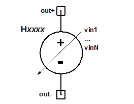 Polynomial CCVS Netlist ExamplesH21 21 0 CCVS POLY(1) V1 1.1 2.1 0 3.1 H31 31 0 CCVS POLY(2) V1 V2 1.2 2.2 0 0 0 0 0 0 3.2 0 H41 41 0 CCVS POLY(3) V1 V2 V3 1.3 2.3 0 0 + 0 0 0 0 0 0 + 0 3.3 0 0 0 0 0 0 0 4.3