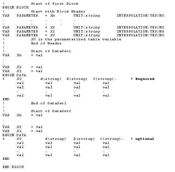 Note that for the extended NMF data shown above: A(string) in a data set is used to define the name of the column and describe the unit/format of each data column. A is the name string = string1 UNIT:string2 string1 is optional and represents the format information. The format can assume one of the following values: REAL (default) RI (expects a 2-column data with no header required for the second imaginary column ) MA (expects a 2-column data with no header required for the second angle column ) dB (expects a 2-column data with no header required for the second angle column ) UNIT:string2 is optional and represents the unit information e.g., pF, dB, dBm, ...etc. A data block must always start with BEGIN BLOCK and end with END BLOCK unless a data file has a single data block, in which case these two statements are not required. A data set within a data block always starts with BEGIN DATA and ends with END. Data sets within a given data block must be of the same type and have the same number of columns. The header of a data set is only required for the first data set and assumed optional for the remaining data sets. If a header is used with each data set, the same header must be used for all data sets within a given data block Multiple data blocks supporting multiple data formats are allowed to be present in a single NMF data file with each data block identified by its corresponding BEGIN BLOCK and END BLOCK statements. Multiple data