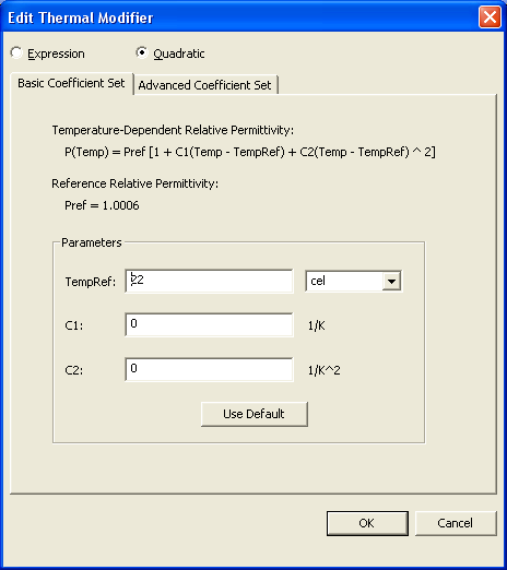 HFSS and Planar EM Simulators > Specify Thermal Quadratic ParametersTo specify Thermal quadratic parameters for a material, you must enable the View/Edit Modifier checkbox for the Thermal Modifier checkbox in the View/Edit materials dialog. Selecting Edit rather than None in the Thermal column causes the Specify Thermal Quadratic Parameters dialog to appear. ![]() In the Basic Coefficient tab, you can edit fields for the TempRef and units, and fields for C1 and C2 for the following equation: P(Temp) = Pref[1+ C1(Temp - TempRef) + C2(Temp - TempRef)^2] where the Pref is defined as the reference relative permittivity. ![]() In the Advanced Coefficient Set tab, you can edit fields for lower and upper temperature limits (TL and TU respectively) and select their units from the drop down. You can also edit the constant value limit for the thermal modifier values outside the limits. By default, these are automatically calculated. Uncheck the Auto Calculate TML and TMU to specify new values for thermal modifier lower (TML) and thermal modifier upper (TMU). Click OK to accept the edits and return to the View/Edit materials dialog.