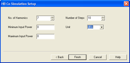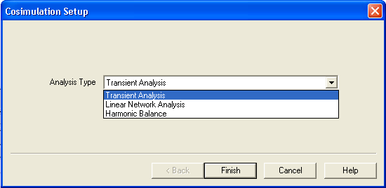 7. Use the pulldown to select an Analysis Type. For Nexxim subcircuits, the choices for cosimulation are Transient Analysis, Harmonic Balance, and Linear Network Analysis. When the System top circuit analysis is Time Domain, the Nexxim cosimulation can be Transient Analysis, Linear Network Analysis or Harmonic Balance. When the System top circuit analysis is Frequency Domain, either Linear Network Analysis or Harmonic Balance can be selected. 8. When Harmonic Balance is selected, an additional Setup dialog opens: