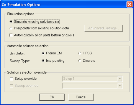 Dynamic Links and Solver On Demand > Pushing Excitations to an EM DesignIn order to view fields and currents in an EM Design you must force the simulation engine to compute and save currents. To do this, navigate to the EM Design in the Designer project tree and insert a simulation setup and discrete frequency sweep into the model. Be sure to select Generate surface currents in the EM Design model. Override the default co-simulation options so that the simulator will use this setup and sweep. Select the EM Design model in the project tree and then click EM Design > Solution Setup > Co-Simulation Options. Then select the setup and sweep that will save the EM Design currents. ![]() When you simulate the top level circuit, the EM Design subcircuit will automatically be simulated using the setup and sweep defined in the Co-Simulation Options dialog. After simulating the circuit/field-solver combination, you can right click on the field solver element in the schematic editor and choose which solution and frequency to use to populate the field solver excitation values.