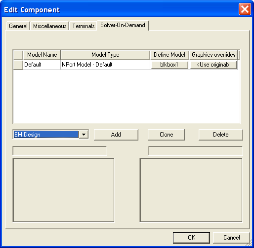Component Type Definitions Solver On Demand allows you to define any number of the following: Planar EM cosimulation models through a Planar EM design. The footprint geometry is copied over to a new Layout. You can decide at definition time whether the design will be shared for all instances or if a new design should be created. HFSS cosimulation models through a Dynamic Link component. You can decide at definition time whether this dynamic link component will be reused across instances or if a new one should be created for each instance. Netlist models defined directly with a netlist editor. Various models selected from component libraries, including: Planar EM, Custom, Netlist, MultiProduct Netlist, C Model, NPort Model, HFSS Model, Q3D Model, SIwave Model, Parametric NPort Model.