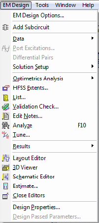 The Designer Desktop > EM Design PulldownThe following pulldown is available when an EM Design is active: