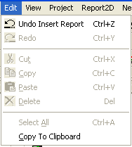 The Designer Desktop > Edit Pulldown for Report WindowWhen the Report Window is the active window, the Edit pulldown menu is the following:
