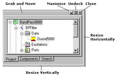 Dockable Project Manager Window The Project Manager window is a dockable window. It can be moved and sized any way you want it and it can attach itself to any edge of the Designer Desktop. There are controls on the window when it is docked, as shown below:
