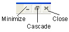 Clicking the white rectangle on an iconized window opens the same popup as the one shown above. To restore an iconized window to its previous size (cascaded or maximized), click the white rectangle, then select Restore on the popup. Alternatively, use the Cascade or Maximize buttons on the icon to restore the window to the desired configuration. Use the Close button to close the iconized editor window. Reposition the icons anywhere in the Design area by dragging them with the left mouse button. To restore the icons to a neat row at the bottom of the Design Area, use the Arrange Icons command on the Window pulldown. To relocate an iconized window in the Design Area, drag it with the left mouse button. Click Maximize (or use the Maximize icon) to enlarge the editor window to fill the entire Design Area. In this configuration, Minimize, Cascade, and Close icons appear at the upper right of the Designer Desktop, on the same level as the Top Menu bar: