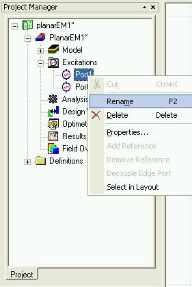 3. Rename Port 1: a. In the Project Manager, expand the project PlanarEM1: Excitations, then right-click Port1. b. Click Rename, enter p1, and then press ENTER.