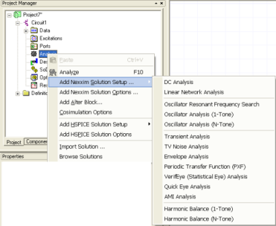 Getting Started with Ansoft Designer > Create a Solution SetupYou tell Designer what type of analysis to perform and what frequencies/time-ranges to analyze by creating a solution setup. The types of solution setups you can add to a particular design depends on the design type: To a PlanarEM design, such as EM Design and HFSS, you can only add frequency sweeps To a Nexxim circuit design, you can add frequency sweeps, transient analyses, harmonic-balance analyses and several other types of setups To add a solution setup to a Nexxim design, right click on Analysis in the Project Manager and choose Add Nexxim Solution Setup and then select the appropriate analysis type: