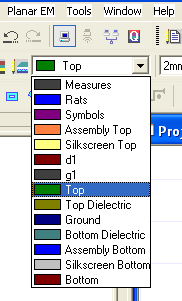 Getting Started with Ansoft Designer > Draw the Model1. Make sure that the active layer is set to “Top”: If necessary, on the Layout toolbar, select “Top” from the list of layers: