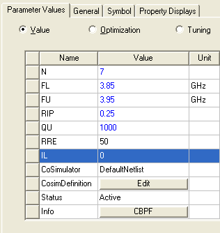 Getting Started with Ansoft Designer > Edit Filter PropertiesDefine the parameters for the three filters. Identify them as Filter1, Filter2, and Filter3, ordered from left to right. 1. Double-click the schematic symbol for Filter1, and the Properties dialog box appears. 2. Enter new values for N, FL, FU, RIP, and QU as shown, leaving the other property values unchanged. If a property has units, you can enter the units along with the value in the Value column, for example, 3.8GHz. Or enter the units in the Unit column. Press Enter after each new value has been entered to move to the next line.