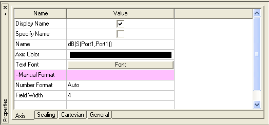 Click on different parts of the report, or click on traces in the Project Manager, to change properties in the Properties window. For example, clicking on the Y axis in the report window gives the following options. (Clicking on different parts of the plot will yield different options.)