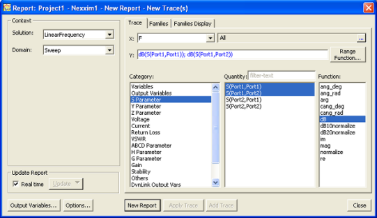 Getting Started with Ansoft Designer > Generate an Analysis ReportTo view your simulation data you must create a report. A wide variety of report types can be created in Designer. Note that some report types are only available for certain types of designs and analysis types.