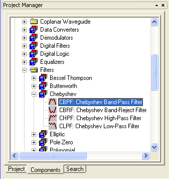 Getting Started with Ansoft Designer > Place the FiltersStart by placing three filters in the design. 1. Click the Components tab in the Project Manager, and then expand the System Elements/Filters folder and the Chebyshev icon.