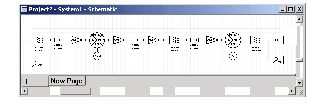 Getting Started with Ansoft Designer > Place the Voltage and Power ProbesNext, place two voltage probes and a power probe to provide test points for the analyses. 1. In the Project Manager window Components tab, under the System Elements folder, expand the Probes icon and select VP: Voltage Probe (located at the bottom of the list). 2. Place two copies of the voltage probe (input and output) as shown. 3. Click the cursor over the terminal on the leftmost voltage probe. The cursor changes to an “X” to indicate the start of wire mode. Click the cursor over the open terminal on the leftmost filter. A wire is added between the two terminals. 4. Using the same procedure, wire the right voltage probe to the terminal on the rightmost filter. 5. Select PP: Power Probe from the Probes group and insert it as shown: