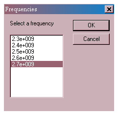 3. Do the following: Under Scale, select Auto Scale and Logarithmic. Under Color Map, in the Ramp and Levels lists, select 21 and Temperature. Under Magnitude, in the Surface Deviation list, enter 3mm. Leave the other settings unchanged, and click OK. 4. Phase animate the currents: a. Under Field Overlays in the project tree, right-click Setup 1: Sweep2 Currents, and then click Frequency on the shortcut menu. The Frequencies dialog box appears. b. Select 2.7 GHz from the list and click OK.