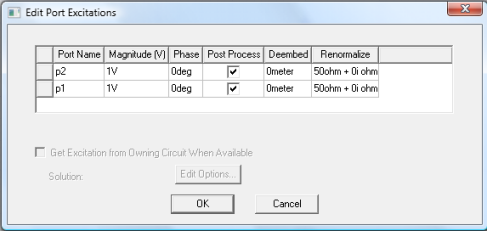When all settings are as desired, click OK to close the dialog. Alternatively, the following method would be convenient for multiple-port designs. You can right-click Excitations in the project tree, and then click Port Excitations on the shortcut menu. The Port Excitations dialog box appears, in which you can modify port excitations.