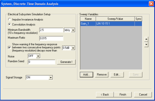 3. Select Convolution Analysis. 4. Set Minimum Bandwidth to 2.5 MHz and Maximum Ratio to .015, as shown. 5. To set the Sweep Variables: Click Add, and the Add/Edit Sweep dialog box appears. 6. In the Variable list, select Gain_1. 7. Select Linear Step and enter, 10, 15, and 1 in the Start, Stop, and Step fields. Click Add. 8. Click OK and then click Finish to close the Add/Edit Sweep and System, Discrete-Time Domain Analysis dialog boxes. HFSS视频教程 ADS视频教程 CST视频教程 Ansoft Designer 中文教程 |