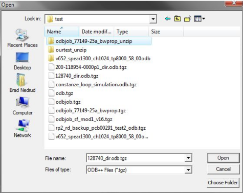 To translate an ODB++ job file or folder, click on the [Action] cell of the ODB++ line in the Designer Links tab of the Designer Links dialog above and choose "Import" from the dropdown menu. This opens the following dialog. ![]() Select a folder in the display window of the Open dialog. Next, click the Choose Folder button at the lower right to translate the selected folder. If you wish to use a control file, be sure it has the same name as the ODB++ file/folder (with extension .xml) and is located in the same folder. If necessary, the ODB++ file is decompressed and then translated to an ANF file plus a LOG file, then the ANF file is read into Designer. Translation warnings and error messages written to the log file also appear in the Message Window. The temporary ANF and LOG files will be automatically deleted.