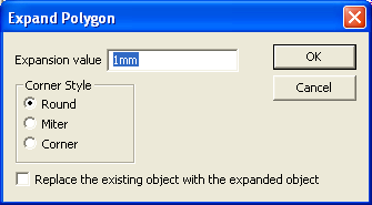 Expansion value can be positive or negative (e.g., “2mm” or “-2mm”). The object is expanded or shrunk by the distance specified. The Corner Style (where expanded sides meet) can be specified as Round, Miter, or Corner. When Corner is chosen, if the corner extension results in a projection greater than 8 times the expansion value (which corresponds to angles approximately 15 degrees or less), then the two meeting sides are truncated to reduce the corner projection. You may either Replace the existing object with the expanded object or, by default, create a new object.