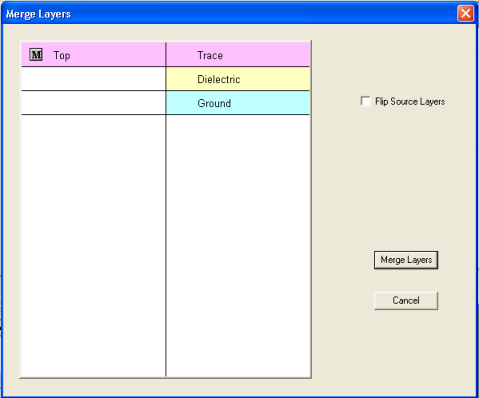 The dialog shows the object layers on the left and the design layout layers on the right. In the example above, the object has just one layer (Top) while the layout has three layers (Trace, Dielectric, and Ground). When an object layer is adjacent to a layout layer (the Top and Trace layers in the example above), the M button is displayed, and the layers will be merged. When an object layer is adjacent to a blank cell on the layout, the I button is displayed, and the object layer will be inserted: