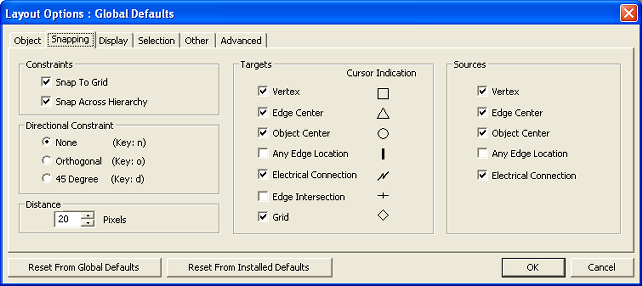 When creating or placing a component initially in the Layout Editor, it is the cursor that snaps to the target. As you move and place objects, the shape of the cursor changes to indicate the target being snapped to. The options you may select under Targets and Sources are not mutually exclusive, and you may select none, some, or all of them. When multiple sources or targets are selected, the closest of these will snap to each other as you create and move objects. Sources defines the part of the object you are placing that will snap, and Targets defines what is snapped to.