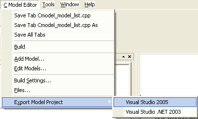 Save Tab xxx.cpp — Saves the contents of the specified tab file to the associated file. Save Tab xxx.cpp As — Saves the contents of the specified tab file to a user-specified file. The tab and model remain associated with the original file. Save All Tabs — Saves the contents of all tab files to their associated files. Build — Creates a dll from the files. Add Model — Opens a C Model Dialog to gather information for a new model to be added to the project. The dialog will open with a unique model name default. The model project file control and Dll control will default to those in use by the editor. Edit Models — Opens a dialog to choose a model to edit from a list of project models associated with the editor. Build Settings — Opens a dialog to specify build settings. Files — Opens a dialog to add file paths to, or remove them from, the model project file. Paths with variables such as $USERLIB are displayed with variables, rather than expanded to absolute paths. Export Model Project > Visual Studio 2005 — Creates the designated Visual Studio project file using the current model project file. Export ModelProject > Visual Studio .NET 2003 — Creates the designated Visual Studio project file using the current model project file.