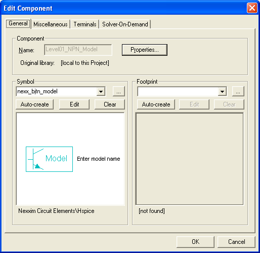 Each Edit Component dialog tab (General, Miscellaneous, Terminals, Solver On Demand) contains both a symbol and footprint preview window which are automatically updated to reflect whatever changes you make to the symbols and footprints you modify. The changes you make when creating or editing a component are saved to a definition within the current project, not the “parent” library. If the edited component is used in any schematics within the project, all default-value instances of the parameter(s) changed are updated immediately. To make a newly created/modified component available for use in other Designer projects, you must export it to a user or personal component library (.aclb) file using the Edit Libraries dialog. The library must be configured (added to) to the circuit or schematic within the target project. To update another project with your updated component(s), select its icon in the project tree, then click Update Definitions on the Tools menu.