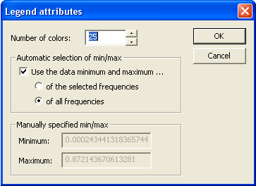 Number of colors: number of color entries in the legend, i.e. the number of divisions between the start/end of the data range. Use the data minimum and maximum: automatically select the data range using the minimum and maximum values from either just the selected frequencies or all frequencies in the data set. Minimum & Maximum: when the range is not automatically determined, these fields permit the user to manually enter hard values, e.g. for S parameter data magnitude data, a mimum of 0 and a maximum or 1 could be used.