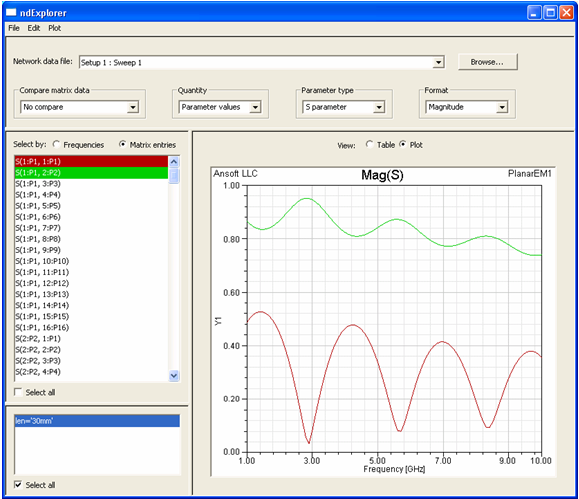 Network Data Explorer > Displaying a Graph of a Cell Across All Frequencies1. Select Parameter values in the Quantity control field. 2. Select Matrix entries in the data selection pane at left. 3. Select Plot in the data view pane at right. 4. Choose the cells and variations to display. 5. Select Plot > Log Frequency to switch the X axis to a log scale.