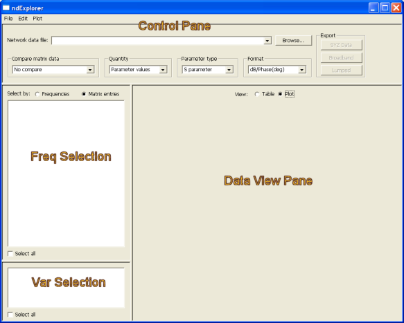 Network Data Explorer > NdExplorer OverviewTo open the NdExplorer, click Tools > Network Data Explorer. The NdExplorer window is divided into the following panes: Control Pane across the top Data View Pane to the right Data Selection Panes to the left — divided into Frequency Selection and Variation Selection