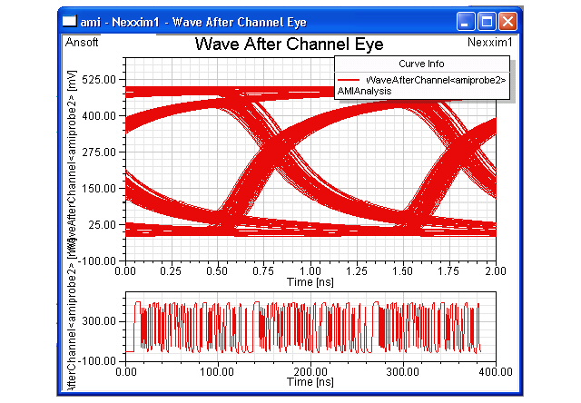 Nexxim Simulator > AMI Eye Diagram WaveformsThe report can show Eye diagrams of the waveform at four points in the circuit: The Initial Waveform shows the Piecewise Linear data input to the transmitter, including any jitter. The Waveform After Source shows the output from the transmitter. The Waveform After Channel shows the input to the receiver. The Waveform After Probe shows the output from the receiver. To plot the impulse responses, select Create Eye Diagram Report>Rectangular Plot. Select your AMI Analysis as the Solution; Time as the Domain; Voltage as the Category; InitialWaveform, EyeAfterSource, EyeAfterChannel, or EyeAfterProbe as the Quantity; and <none> as the Function. The chart below shows the Waveform After Channel.