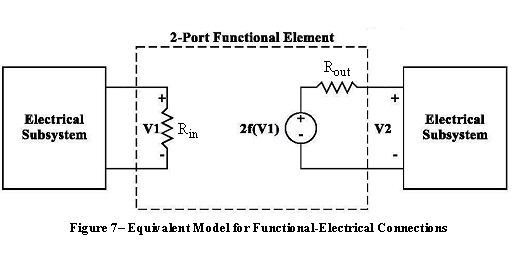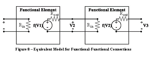 2. The impedance seen by an electrical component or sub-design looking into an output port of a functional component is assumed to be Rout (defaulted to a short or 0Ω) also shown in Figure 7. In other words, when an electrical component or sub-design input port is connected to the output port of a functional component, the assumed source resistance is Rout. This source resistance can be adjusted by assigning a different value to the Rout parameter of the functional component. Note that in reference to Figure 7, the input voltage to the electrical sub-design V2 would equal f(V1) if the impedance seen by the functional component looking into the electrical sub-design is 50Ω, provided that Rout is set to 50Ω. The notation f(.) represents the equivalent signal processing operation of the functional component. 3. The impedance seen by a functional component looking into an input port of another functional component is assumed to be Rin (typically defaulted to infinity) and the impedance seen by a functional component looking into an output port of another functional component is assumed to be Rout (typically defaulted to zero). This is illustrated in Figure 8 below.