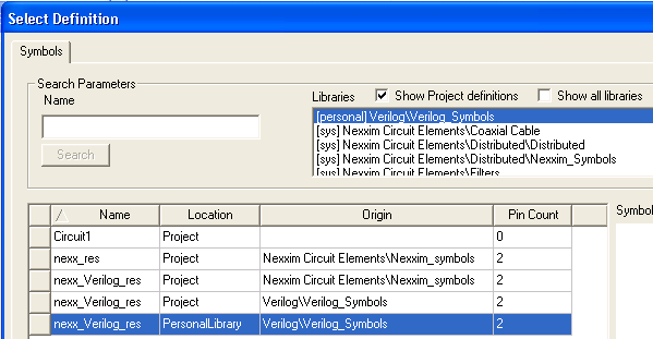 4. Under the Symbol field on the Edit Component dialog, click the Browse (...) button. The Select Definition dialog opens. Make sure that the Show Project definitions is checked (on) and the Show all libraries checkbox is unchecked (off). Select [personal]Verilog/Verilog_Symbols from the libraries listing, then select the nexx_Verilog_res from the Personal Library location in the listing. Click OK to close the Select Definition dialog.