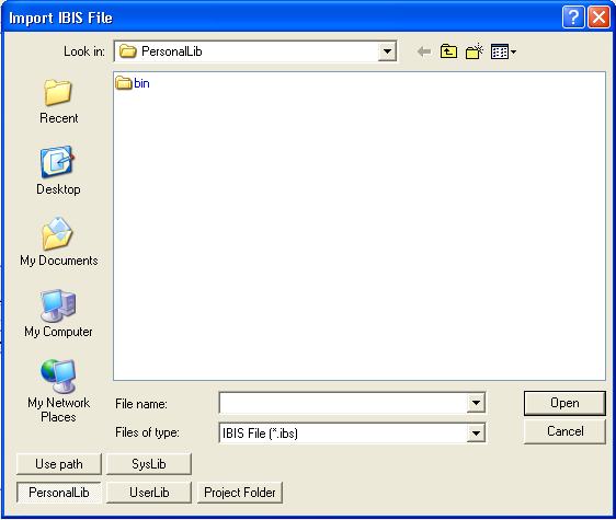 2. Specify the location of the IBIS file by clicking Use Path, PersonalLib, UserLib, or SysLib.