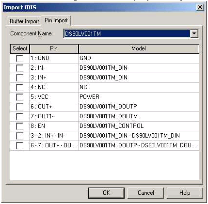 3. Within the PersonalLib, userlib, or syslib folder, select the file from those listed, or type the name of the file in the File Name box. Note that syslib is reserved for libraries supplied with Designer. If you select Use path, type the name of the file in the File Name box, or use the Look in field to navigate to the file and record its name. Note that components or libraries imported with Use Path may not be portable when the project is moved to another machine. When the In project folder button is selected, references to the file in the design are relative to the directory where the project resides. In this case, the path is saved in the project .asdn file as a variable such as: .lib '$PROJECTDIR/x_113854.ibs' The variable $PROJECTDIR will be expanded to the current location of the project when the design is converted to a netlist and run by an analysis tool. Otherwise, an absolute path is saved. If you move a project and its library files together to a new directory, you can preserve the file references by selecting the Project Folder option. 4. Click Open. 5. This opens the Import IBIS dialog. ![]() The Import IBIS dialog lists all the IBIS components that are contained within the library. Check a box in the Select column for each component that you wish to import. Open the Pin Import tab to specify the pins that are to be imported for each imported component. ![]() If the IBIS file contains differential pins, they appear on the pin list: