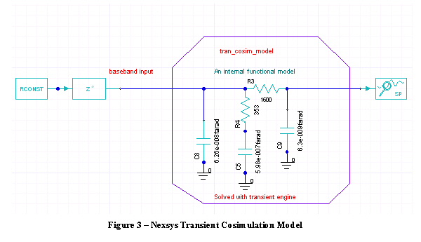 Nexxim Simulator > Nexsys Partitioning and Scheduling ProcessPrior to running the discrete time system simulation, Nexsys partitions the mixed mode system, converting the mixed-mode topology to a purely functional topology where the signal flow is unidirectional. Electrical subcircuits must be modeled functionally or behaviorally after accounting for all impedance mismatches, noise, and other electrical effects. After finishing the partitioning is completed, the process of scheduling all components inside the system for discrete time simulation begins. Since discrete time signals flow unidirectionally from input to output, the order in which components are scheduled is critical during discrete time simulation. The scheduling process begins with the source components in the system and then iteratively schedules each remaining component (after ensuring that all components leading to the input of that component have already been scheduled). A SAMPLER component is placed at the physical/functional interface where each Nexxim source connects to a Nexsys component. The sampling rate specified for the SAMPLER sets the Nexsys timestep. During partitioning, Nexsys packs each set of connected electrical components into an internal functional model based on the signal type (baseband or bandpass) of the input to the electrical components. Nexsys Transient Cosimulation Model When the input signal type is baseband, Nexsys uses a Transient Cosimulation model (tran_cosim_model). When the Nexsys time domain simulation encounters a tran_cosim_model, the transient analysis engine is invoked and stays open during the course of the simulation. Data is exchanged at each time step between the top-level Nexsys simulator and the transient engine. (see Figure 3)