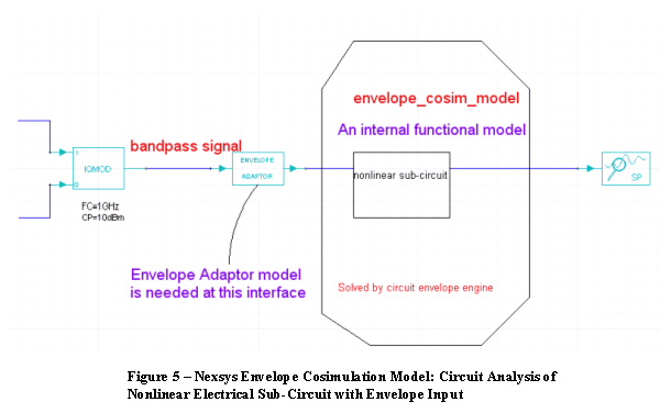 Nonlinear Subcircuits. When the Envelope Cosimulation model sub-circuit is nonlinear, the top level Nexsys simulation engine runs Nexxim Envelope Analysis to solve the circuit and interactively exchange data as described above for the tran_cosim_model. (See Figure 5) .
