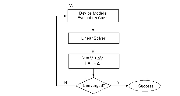 Nexxim Simulator > Nonlinear and Linear SolversHarmonic balance applies Kirchhoff’s Current Law (KCL) at each node for each independent frequency, then solves the nodal equations supplied by the device models in the frequency domain, yielding the steady state frequency spectrum at every node and every branch. In this way the frequency spectrum for all the currents at each node is “balanced”. The algorithm combines a nonlinear solver with a linear solver. As illustrated in Figure 1, the nonlinear solver is an outer loop that arranges the equations so that they can be solved with a linear solver in an inner loop. Figure 1. Nonlinear Solver Loop