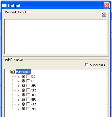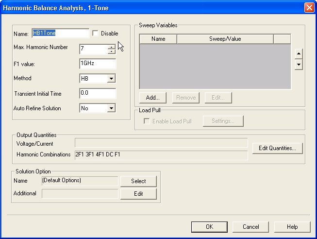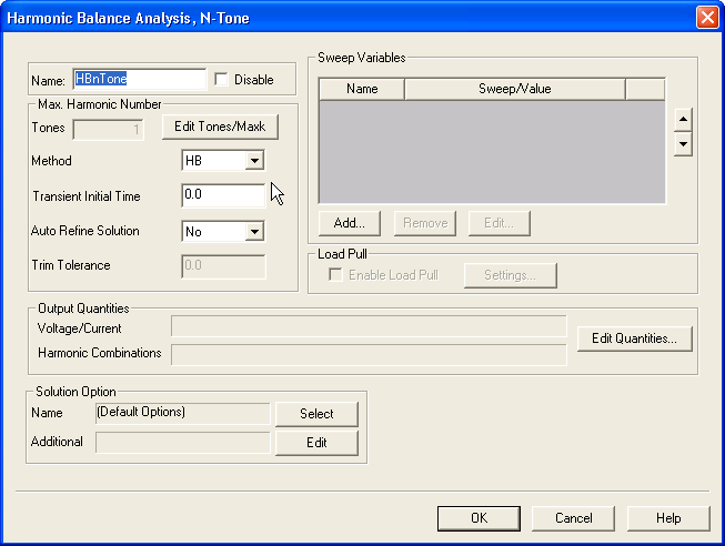 Type an Analysis Name (or accept the default name, “HBnTone”). For most simulations, leave the Disable box unselected (the default setting). Selecting this box lets you store multiple solution setups for later use. (Note that if a solution setup is disabled before the analysis is run, any changes made to the design will invalidate the simulation results.) Click the Edit Tones/Maxk button. The Edit Tones/Maximum Harmonic Number dialog opens. Set the No. of tones; the dialog shows that number of tones. Click on the Value field for each tone to enter the desired frequency. Click on the MAXK field for each tone to enter the maximum harmonic number. Click OK to close the Edit Tones/Maximum Harmonic Number dialog and return to the Harmonic Balance Analysis, N-Tone dialog. If you set the No. of tones to 1, the analysis becomes a single-tone analysis. With this setup, the Method field is enabled. Select HB or Shooting (HB is the default). See Handling Strongly Nonlinear Circuits for details on the METHOD entry in the HB statement. Optionally, set Transient Initial Time to a positive non-zero value representing time required for Transient to stabilize before HB begins using the result. Optionally, set Auto Refine Solution to Yes (default is No). See Increasing Accuracy or Speed for details on the AUTO_REFINE_SOLUTION entry in the HB statement. When the number of tones is greater than one, the Trim Tolerance field is activated. See Increasing Accuracy or Speed for details on the TRIM_TOL entry in the HB statement. 5. To add a sweep, locate the Sweep Variable area in the Harmonic Balance Analysis dialog box. In the Sweep Variable area, click Add, and the Add/Edit Sweep dialog box appears. In the Variable list, select Temp or the name of a variable (when a variable has been defined for the design), and then select one of the following: Single value, Linear step, Linear count, Decade count, or Octave count. Type the sweep values into the Value text box (for Single value), or into the Start, Stop, and Step text boxes (for Linear, Decade, or Octave count), and make sure that the appropriate units are selected for each. For details on sweeps, see Variable Sweep. Click Add, and then click OK to close the Add/Edit Sweep dialog box. The Harmonic Balance Analysis dialog box reappears. 6. Click the Edit Quantities button to open the Defined Output dialog. In addition to the circuit nets and nodes, you can select the harmonics to include in the analysis: