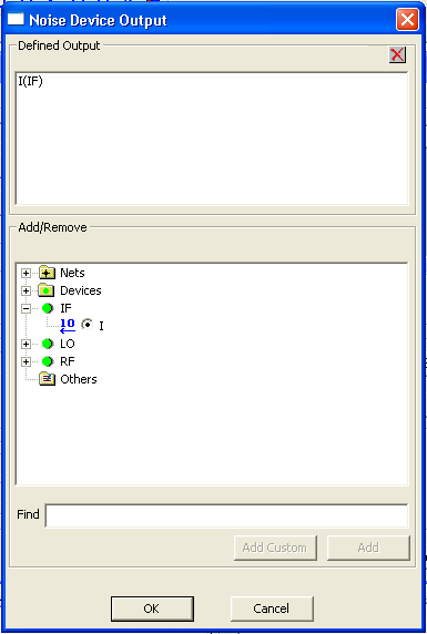 The No. of tones, Name, and Value fields reflect the settings from the Edit Tones/Maxk dialog. The number, name, and value of tones cannot be changed in the Edit RelHarmNum dialog. Click OK to return to the Periodic Transfer Function dialog box. Click in the RelHarmNum field for a frequency to set the relative harmonic number offset for that tone. Refer to the TV Noise Technical Notes topic for information on the use of the RelHarmNum offsets. Click OK to return to the Periodic Transfer Function dialog box. 8. Select the Analysis type from the pulldown. The default is harmonic balance (HB). You can choose oscillator analysis (OSC) instead. When HB is the Analysis type and one-tone analysis has been specified in the Edit Tones/Maxk dialog, the Method field is activated. Use this field to select HB or shooting (HB is the default). See Handling Strongly Nonlinear Circuits in the HB topic for details on the Method entry. When HB is the Analysis type, the Auto Refine Solution field is activated. Use this field to select Yes or No (No is the default). See Increasing Accuracy or Speed in the HB topic for details on the Auto Refine Solution entry. When HB is the Analysis type and more than two tones have been specified in the Edit Tones/Maxk dialog, the Trim Tolerance field is activated. Use this field to set a tolerance value. See Increasing Accuracy or Speed in the HB topic for details on the Trim Tolerance entry. 9. Optionally, click the Edit button at the lower right of the Steady State Quantities panel to add voltages, currents, and harmonic outputs from the underlying analysis (HB or OSC). These additional output quantities are available in the Report dialog after simulation has been performed. Expand the Nets and devices icons to display lists of the available quantities. To have Nexxim calculate outputs from the steady state analysis step, use the checkboxes to select the outputs. Expand the Harmonics icon to display a list of the available harmonics. To specify particular harmonics for Nexxim to use when calculating outputs from the steady state analysis step, use the checkboxes to select the harmonics. If you do not select any harmonics, harmonics DC, F1, 2F1, 3F, and 4F1 are automatically selected. In the Report dialog, only selected harmonics are available for plotting. Click OK to return to the Periodic Transfer Function dialog box. 10. The underlying TV Noise analysis requires a sweep of output frequencies. Click Add in the Output frequency and other sweeps field. The Add/Edit Sweep dialog opens. Make sure F (frequency) is the entry in the Variable field. Use the radio buttons to select one of the following: Single value, Linear step, Linear count, Decade count, or Octave count. Type the sweep values into the Value text box (for Single value), or into the Start, Stop, and Step text boxes (for Linear, Decade, or Octave count), and make sure that the appropriate units are selected for each. Click Add, and then click OK to close the dialog box. The Periodic Transfer Function dialog box reappears. The sweep definition appears in the Output frequency and other sweeps field. (The Output frequency and other sweeps display includes fields labeled Offset of F1 and Sync. These fields are not used by Nexxim PXF analysis.) 11. Click on the Edit button next to the Probe field to open the Noise Device Output dialog.