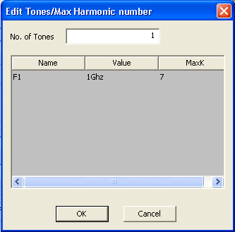 4. Type an Analysis Name (or accept the default name, for example “PXF”). 5. For most simulations, leave the Disable box unselected (the default setting). Selecting this box lets you store multiple solution setups for later use. (Note that if a solution setup is disabled before the analysis is run, any changes made to the design will invalidate the simulation results.) 6. In the Steady State panel, click the Edit Tones/Maxk button. The Edit Tones/Max Harmonic Number dialog opens: