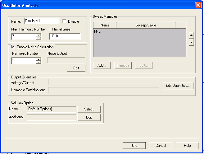1. On the Oscillator Analysis dialog, select (check) the box for Enable Noise Calculation. 2. In the Noise Calculation panel, select the Harmonic Number. The Harmonic Number value selects one of the harmonics of the oscillator frequency around which to calculate the phase noise. The default is harmonic number 1 (the fundamental oscillating frequency). 3. Click the Edit button in the Noise Calculation panel to open the Noise Output dialog. Expand the icons for the nets and devices, and then use the checkboxes to select one or more outputs for noise analysis. 4. In the Sweep Variables panel, you can add a sweep of the noise frequencies to be calculated, with or without a second sweep of temperature. The swept frequencies are offsets from the calculated oscillating frequency. To add a sweep of noise frequencies, select FNoi from the Variables list and click the Edit button. The Add/Edit Sweep dialog opens. Select the Single value, Linear step, Linear count, Decade count, or Octave count button, then complete the specification by filling in the numeric fields. Click the Add button to add the sweep to the Sweep Values list. To add a sweep of temperature, click the Add button in the Sweep Variables panel. The Add/Edit Sweep dialog opens. Select Temp from the Variables list. Select the Single value, Linear step, Linear count, Decade count, or Octave count button, then complete the specification by filling in the numeric fields. Click the Add button to add the sweep to the Sweep Values list. Click OK to close the Add/Edit Sweep dialog and return to the Oscillator Analysis dialog. 5. When all setup steps are as desired, click Finish on the Oscillator Analysis dialog. The solution setup is added to the Project tree under the Analysis icon. 6. Run the simulation: Click on the solution setup in the Project tree and click Analyze from the menu. If the circuit is set up correctly, the analysis begins immediately and a red progress bar appears. If the analysis is not successful, an error message appears in the Message Window. Check the Message Window for an explanation, and then take corrective action. 7. Display results: On the menu bar, click Circuit and then click Create Report. (Alternatively, select Create Report from the Results icon in the Project Manager window.) The Create Report dialog box appears. Select Standard as the Report Type and Rectangular Plot as the Display Type. Click OK. When the Report dialog box appears, select the appropriate oscillator analysis from the Solution pulldown. Select Noise from the Domain pulldown. Select the Noise Output category. The output quantities you specified in the Noise Output dialog (step 3 above) are available for selection. For most noise analyses, select dB as the function. Click New Report. A Report window opens to display a graph of the analysis results. Double-click on the X-axis (the Fnoi axis at the bottom of the report). The X-Axis Properties dialog opens. Select the Scaling tab, and Select Log for Axis Scaling. Click OK to close the dialog. The report now shows the phase noise in the common double-log format: