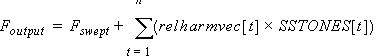 The formula is too complicated to write explicitly. Here is a numerical example. .TV_NOISE Using the default for RELHARMVEC, Foutput is just the swept frequency, one megahertz. The Fonoise vector is calculated for every combination of harmonics (-1, 0, +1) for the 1001-Hz steady-state tone and harmonics (-2, -1, 0, +1, +2) for the 20000-Hz steady state tone. The resulting vector would have (3 × 5) = 15 elements: 1000000 + (0 ×