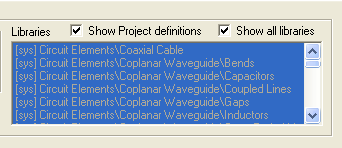 With Show all libraries checked, the display lists Nexxim components with property names that match the ones from the Circuit component. You can search the list by component name or by property name, using the fields in the upper left of the Select Definition dialog: